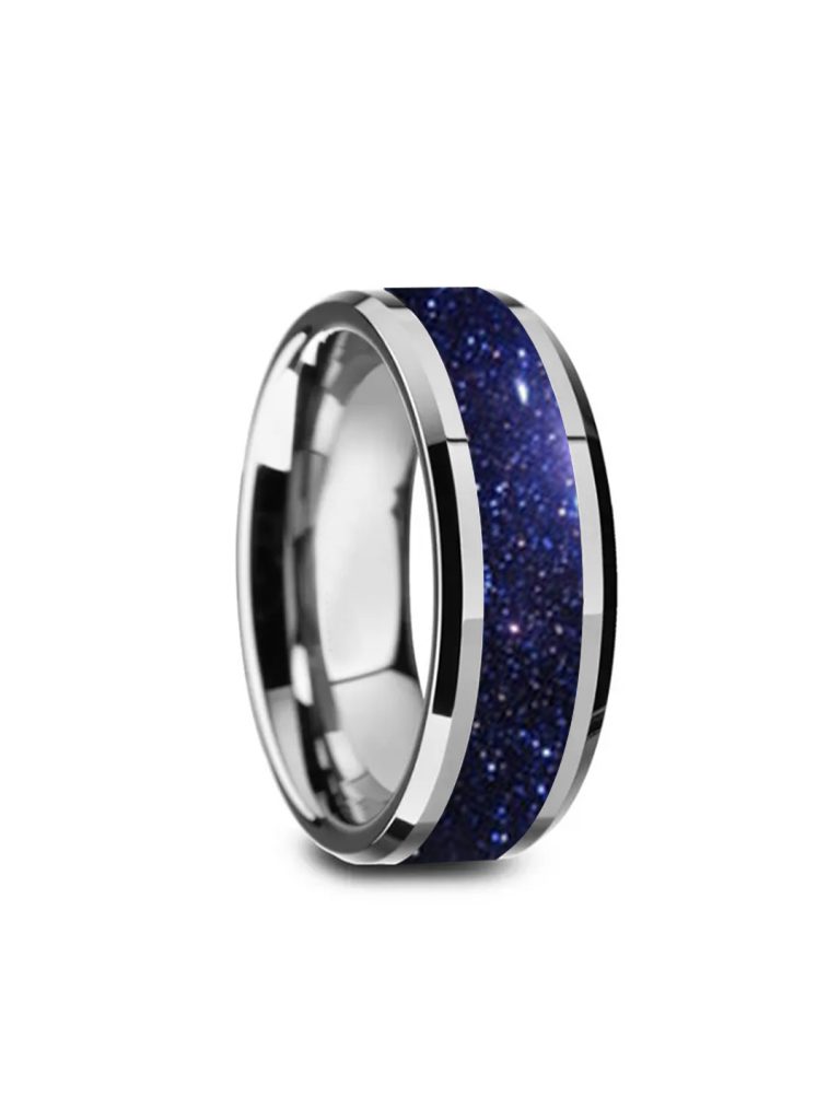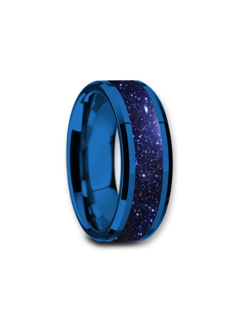 8mm-Tungsten/S.st/Titanium ring with Natural Blue Golden Sand Stone inlay and Blue IP Plating